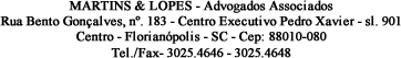 Para proporcionar um melhor atendimento, com conforto e segurança, a Martins & Lopes Advogados Associados atende em sede própria, oferecendo um ambiente apropriado, com infra-estrutura moderna, em localização privilegiada e de fácil acesso no Centro de Florianópolis/SC.